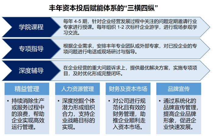 目前,丰年资本形成的“三横四纵”投后赋能体系,配套专业投后团队和体系化工具为企业提供战略规划、精益管理、人力资源、财务及资本市场、品牌宣传等领域的内容,形成多层次、全方位的支持,持续构建高端制造业投资经营能力。