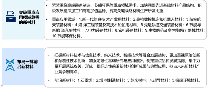材料产业是国民经济支撑性基础产业,而目前我国基础材料工业大而不强。新材料行业作为国民经济先导性产业已上升至国家战略层面,肩负我国从材料大国向材料强国迈进的重担。结合我国新材料产业发展现状及国家政策支持,国内需求旺盛、进口依赖度高、进入技术壁垒高的新材料是产业未来重点发展方向。我国新材料产业未来的两大发展方向,一是重点应用领域必需的新材料,如半导体材料、航空航天装备材料、新能源汽车材料等;二是将会在未来多个潜在领域带来革命性发展的前沿新材料如特种纤维、纳米材料、超导材料、柔性电极材料等。