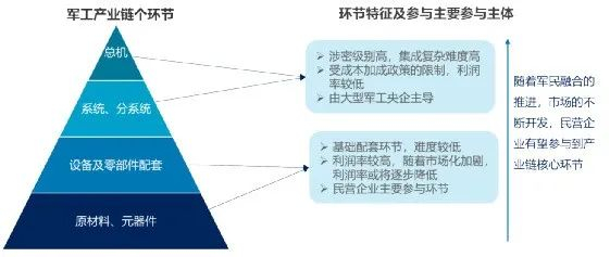 随着国企改革浪潮和军民融合的逐步深化,军工行业的封闭环境被逐步打破,为越来越多的民营企业进入军工行业提供了契机。大型军工央企、民参军公司是军工行业的两大市场参与主体,由于多年来军工行业的封闭性和涉密性,导致目前市场竞争不充分。大型军工央企在众多相关产业中处于垄断地位,主要参与整机、系统集成等产业链中下游关键环节,民营企业主要承担对应的配套产品,主要参与装备制造、基础器件制造和原材料供应等环节。在军工行业未来的发展趋势中,民营企业以其自身的便捷性和可及性通过资产注入等市场化手段在进口替代和产业链迁移等方面将迎来可观的发展机遇。