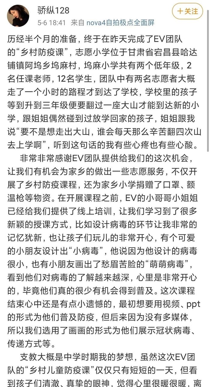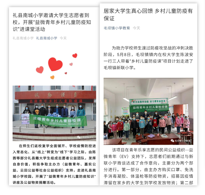 4月中旬,在嘉实公益与益微青年(EV)月捐伙伴的资助下,益微青年(EV)启动“乡村儿童防疫课”项目招募选拔培训滞留家乡大学生学习防疫课程,为其所在县城以下的乡村小学开展开学防疫第一课并提供防疫物资。