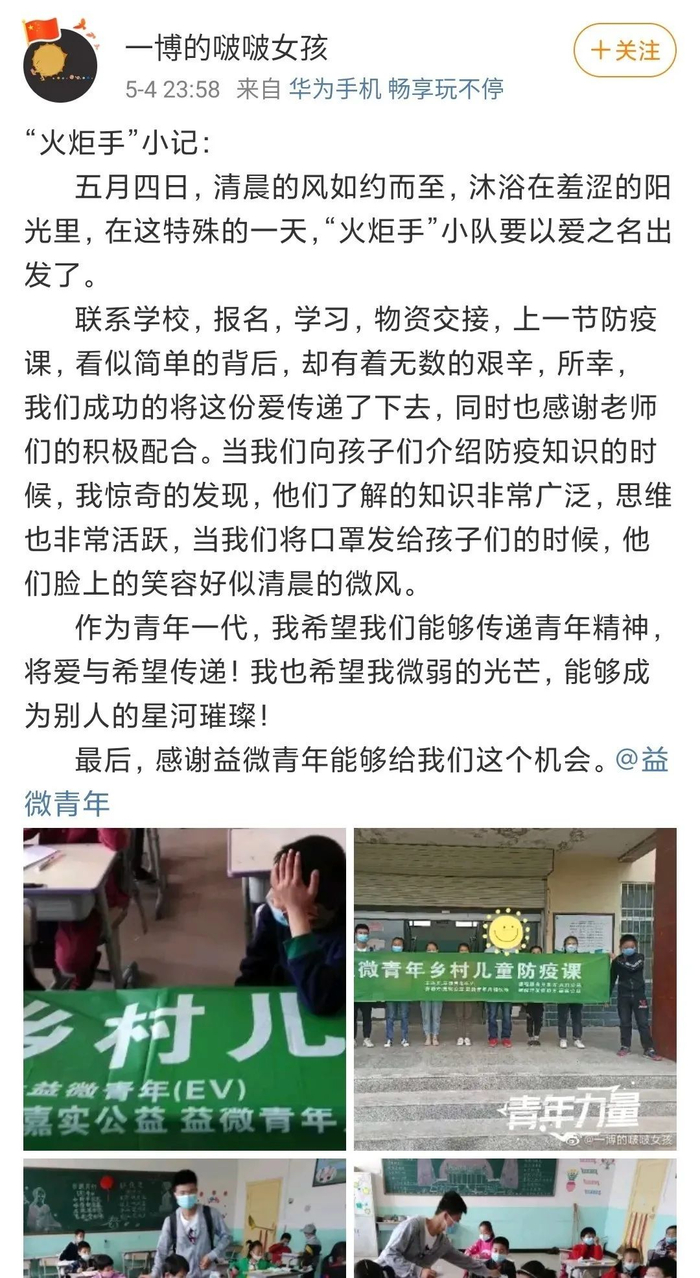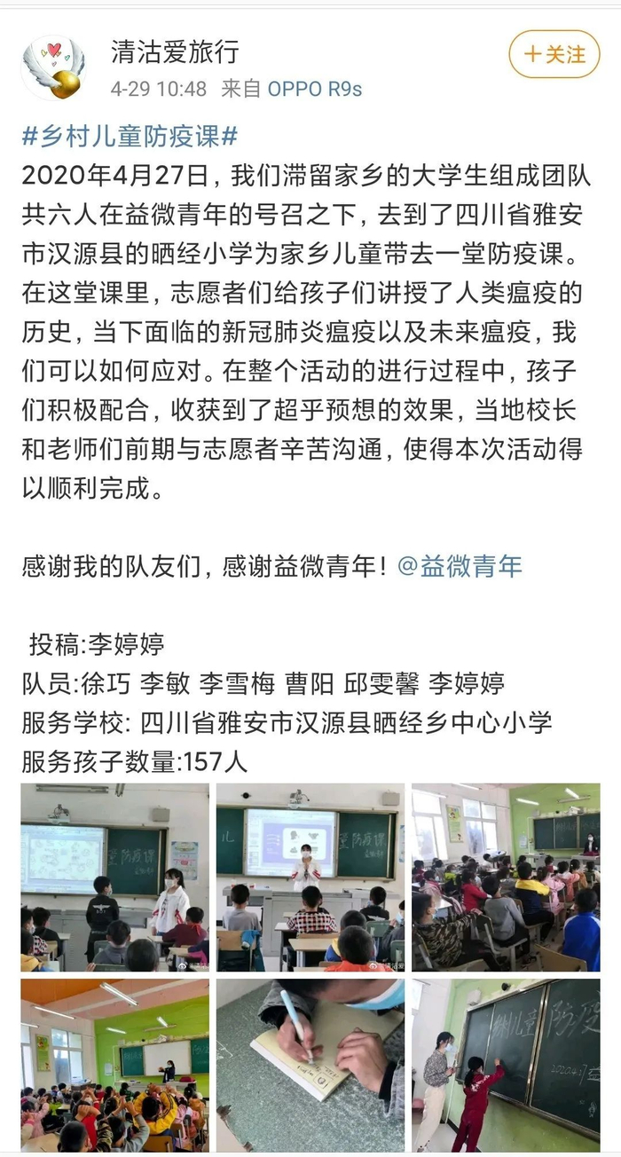 4月27日-5月15日期间,志愿者为16个省份40个城市的78所乡村小学送去防疫课与防疫物资,总服务时长1321小时、教学时长340小时,发放口罩33375只,洗手液352瓶,额温枪130把,总计服务儿童7293名。