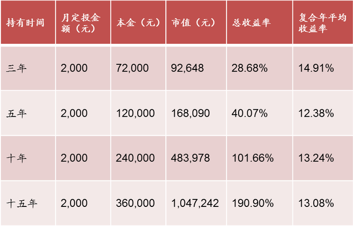 15年间,定投中金300指数的总收益率达190.9%,复合年均收益率达13.08%.