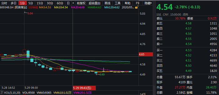 5月29日9:30分,随着A股开盘,阳泉煤业的故事却急转直下,同时也创下了1分钟的天量成交。阳泉煤业开盘4.68元,但一分钟K线图显示,公司股价瞬间达到5.04元,因为时间太快以至于分时图并未显示出该上冲迹象。