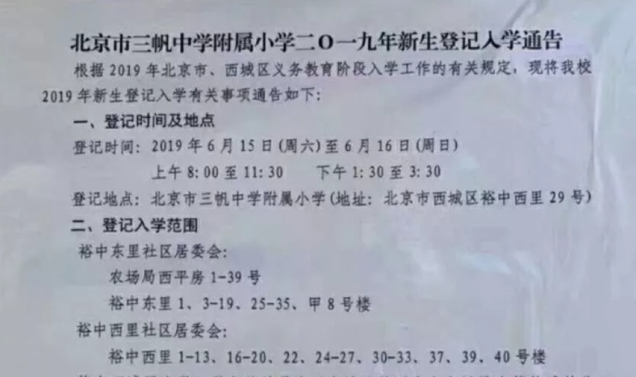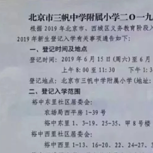 5月29日,北京市西城区三帆中学附属小学(简称为三帆附小)发布了2020年新生登记入学通告。不少人发现三帆附小的招生划片有了变化,今年新增加了2栋楼:北三环中路甲29号院2号楼(华尊大厦)、3号楼(华龙大厦)。
