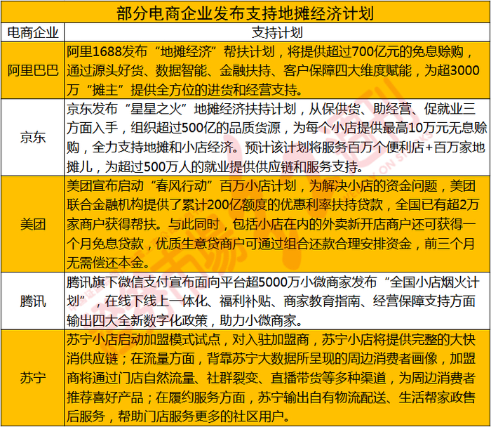 高层喊话之后,国内电商巨头纷纷响应,阿里巴巴、京东、美团等先后发布支持地摊经济计划。5月29日,阿里1688发布“地摊经济”帮扶计划;6月2日,京东发布“星星之火”地摊经济扶持计划,此外美团、腾讯、苏宁等纷纷跟进。