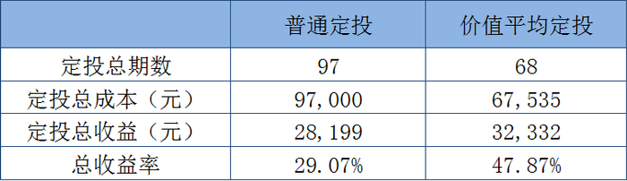 在不考虑交易费用的情况下,以下分别为普通定投及价值平均定投的数据详情:
