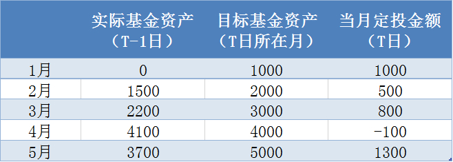 比如,假设某年1月份,我们买入1000份某只净值为1元的基金,后续为了实现每月基金资产固定增长1000元的目标,之后每个月扣款之前,我们就需要视情况调整定投金额,如果实际基金资产小于目标资产,就要增加投资,反之则减少(即赎回)。比如: