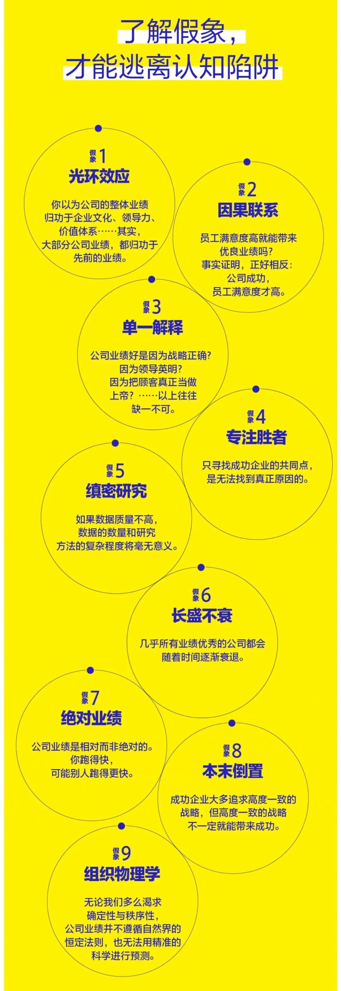 该书大部分的章节都是展示为什么那些权威、专家、学者、教授、新闻记者在很多地方犯了错误,并通过企业案例(乐高、思科、ABB等)、逻辑分析、数据展示等方式揭示了一些管理类畅销书籍中的假象,包括《追求卓越》、《基业长青》、《从优秀到卓越》等大家耳熟能详的书籍,这类书籍的通病都是强调确定性、强调清楚的因果关系而不是偶然性和不确定性。企业永远不可能只要遵循某些特定步骤就能成功,更为接近真相的是市场竞争下企业的竞争优势通常很难长期持久。作者在书中总结了背离商业真相的九大假象。例如假象之一就是光环效应,即人们倾向于先了解业绩表现,再找出成因,例如将一个公司的整体业绩归功于企业文化、领导人、价值观等,但事实上却是反过来的,大部分被称作企业业绩驱动力的因素往往要归功于企业先前优秀的业绩。在投资的现实中也是一样,独立思考与偏执死板、耐心坚持与顽固不化、与时俱进与追涨杀跌往往是以最终的投资业绩来区分和解释的。