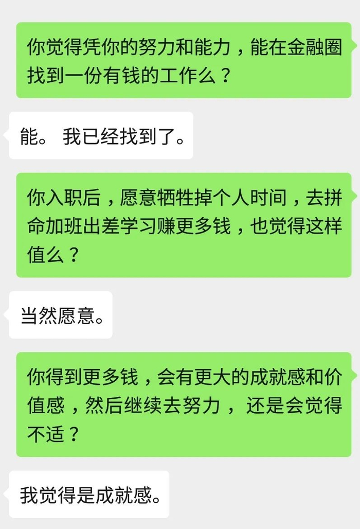 “别纠结了,去金融圈好好工作吧。好好付出,也好好享受钱带给你的成就感和价值感。”