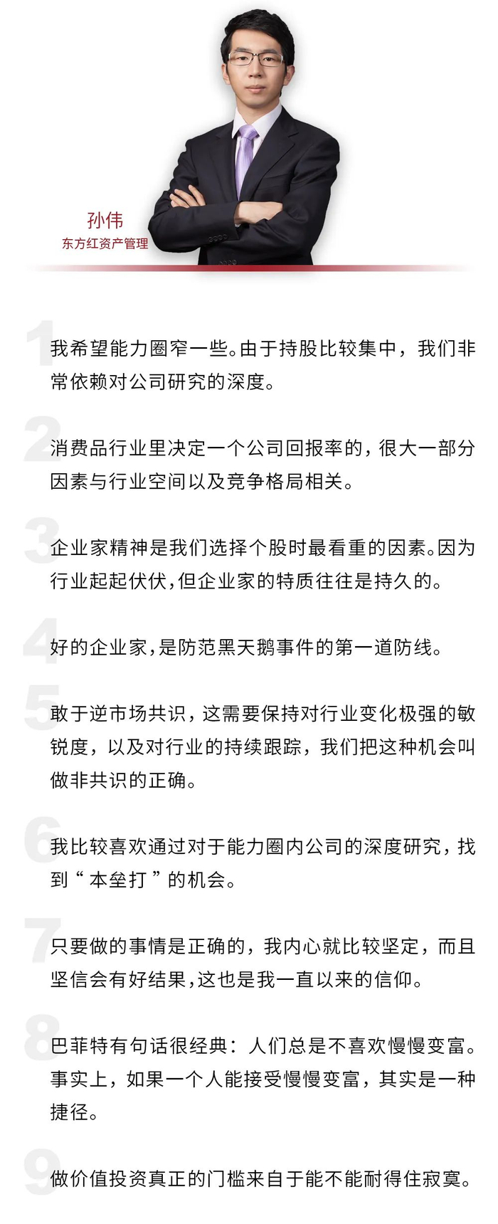 今天我们访谈的基金经理是孙伟。作为资深消费品研究员出身的基金经理,孙伟非常看重能力圈。他认为能力圈应该更窄一些,尽量在能力圈范围内做投资。他对消费品子行业都有长期跟踪,关注行业格局出现的变化,希望在“非共识的正确” 中,找到“本垒打”的投资机会。他非常看重深度思考,希望平时花更多时间在对公司和行业的深入思考上,而不是泛泛而谈。