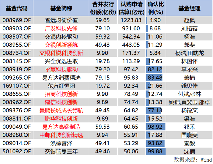 具体来说,Wind数据显示,在年内一日“售罄”且比例配售的偏股基金中,投资者实际认购金额估算超50亿元的有17只,基金名称中带有科技字眼或与科技相关的有10只。比如,招商科技创新、鹏华科技创新、广发科技先锋等。