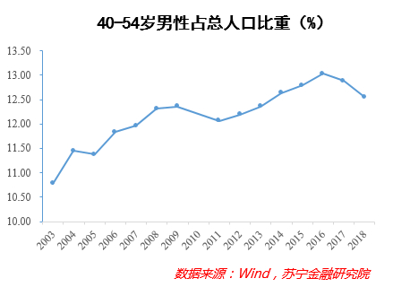 归根结底,消费市场的兴旺源自收入的增加。根据西南证券的研究报告,男人的黄金年龄是40 岁,进入该阶段的男性,无论是财富还是社会地位都有了积累,其消费能力和消费档次也远远高于其他年龄段男性,而国内40~54岁的中年男性人口占比也在逐步提升,这也助长了“他经济”的崛起势头。