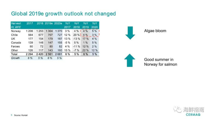 据2019年的一份报告数据显示,近年来,三文鱼产量一直在稳步增长,与2018年的增长相比,2019年和2020年全球三文鱼的产量增长预计依然保持在5%-6%之间,挪威和智利通常在夏季产量的幅度最大(夏季是捕鱼的最佳时节)。