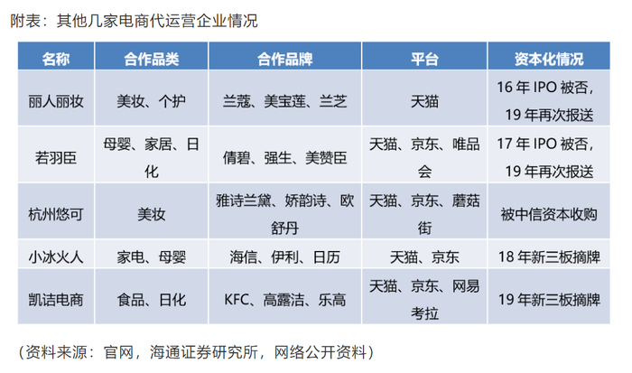 上图几家已经进入资本化运作的电商代运营企业中,丽人丽妆,几经波折,最新消息是6月初已经过会, 有望成为A股市场第二家美妆类代运营商。若羽臣则暂缓审议。