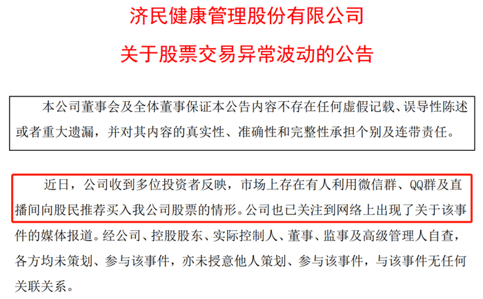 据媒体报道,6月11日当天,散步全国的各种微信荐股群、直播间都在同一时间发布“买入济民制药”的消息。另外,济民制药的公告亦证实了此事。