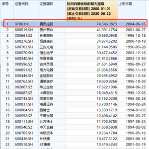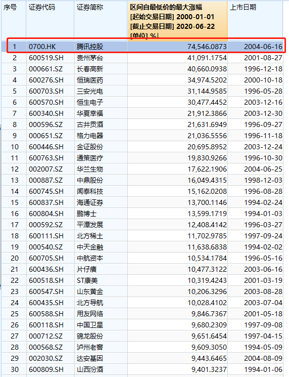 腾讯的股价今日上午再度大涨4.05%,盘中刷出493.8港元的新高;而自2004年上市以来,腾讯股价涨幅超740倍,这一涨幅超过了400倍的茅台、340倍左右恒瑞医药。