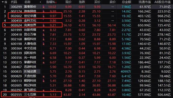 今日上午,游戏股全线暴动,世纪华通、游族网络、富春股份涨停,金科文化、完美世界涨逾9%。