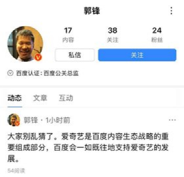6月17日,百度公关总监郭峰在百度APP回应昨日腾讯接洽百度入股爱奇艺传闻称:“大家别乱猜了。爱奇艺是百度内容生态战略的重要组成部分,百度会一如既往地支持爱奇艺的发展。”