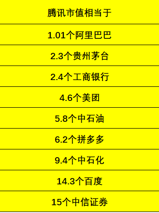 腾讯最新市值4.71万亿港元,相当于4.3万亿人民币,超过阿里巴巴的4.65万亿港元。腾讯市值相当于2.3个贵州茅台、2.4个工行、4.6个美团、5.8个中石油、6.2个拼多多、14.3个百度或15个中信证券。