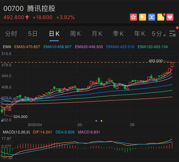 最近多三个月,腾讯的股价已经从3月23日346港元的收盘价涨到了493港元,上涨42.49%。