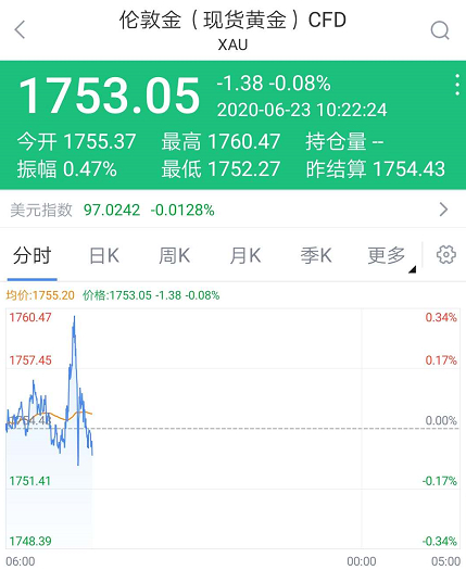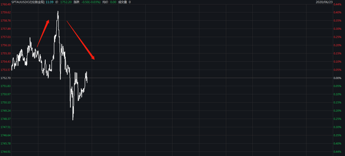 6月23日早盘,国际现货黄金走势突然上演了一波离奇的过山车行情。当天早市,金价一度上冲到1760美元关口,短短10分钟后,金价短线快速回落超8美元,最低跌超14美元,实现了日内飘红到转跌的动荡走势。
