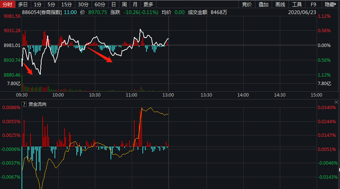 6月23日开盘,券商股指数同样出现了小幅下跌的态势,盘中两度冲击上攻,但指数却几度波折,平盘震荡的趋势明显。券商股涨不动了,这也传递出市场资金的博弈态度。