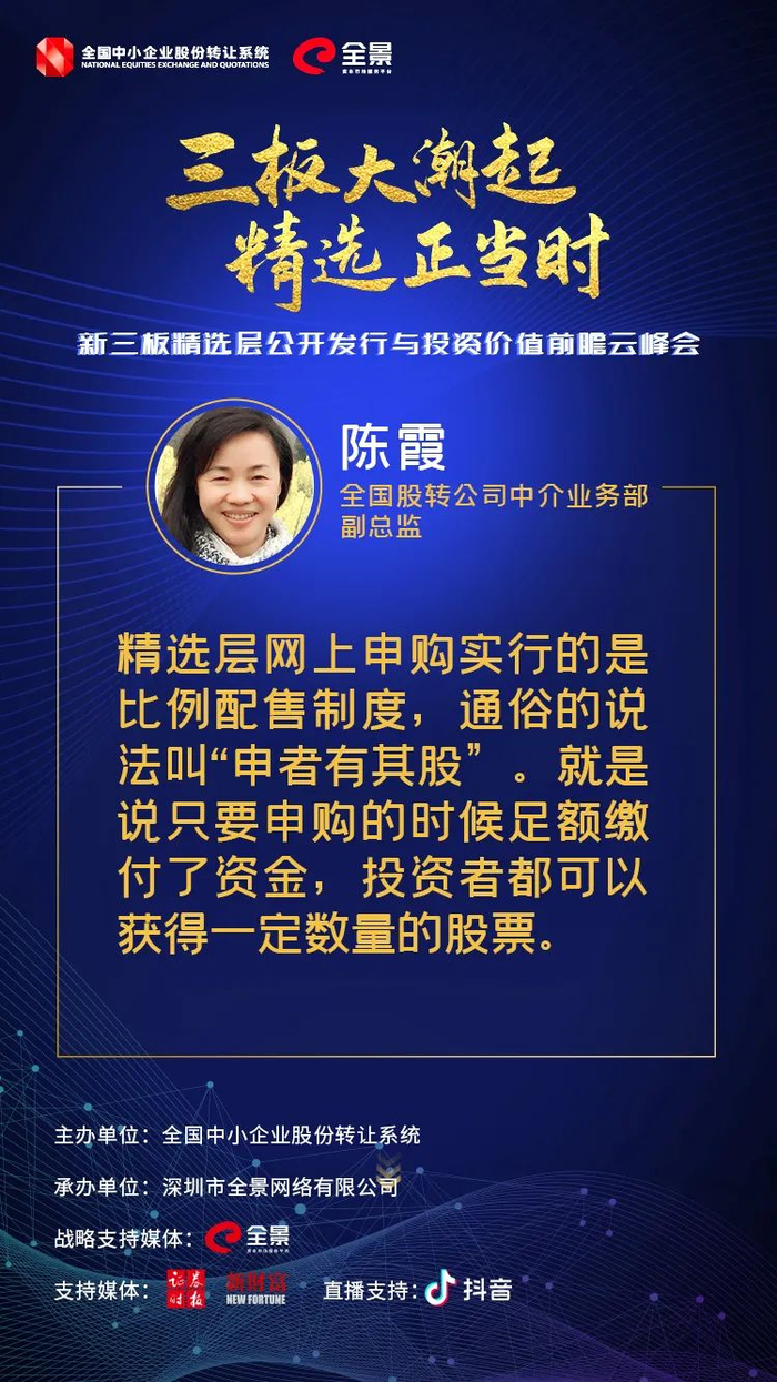 对此,陈霞表示,“精选层网上申购实行的是比例配售制度,通俗的说法叫’申者有其股’,就是说只要申购的时候足额缴付了资金,投资者都可以获得一定数量的股票。”