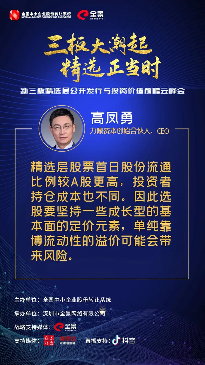 对于精选层投资的风险,力鼎资本创始合伙人兼CEO高凤勇也提醒大家,“精选层股票首日股份流通比例较A股更高,投资者持仓成本也不同。因此选股要坚持一些成长型的基本面的定价元素,单纯靠博流动性的溢价可能会带来风险。”