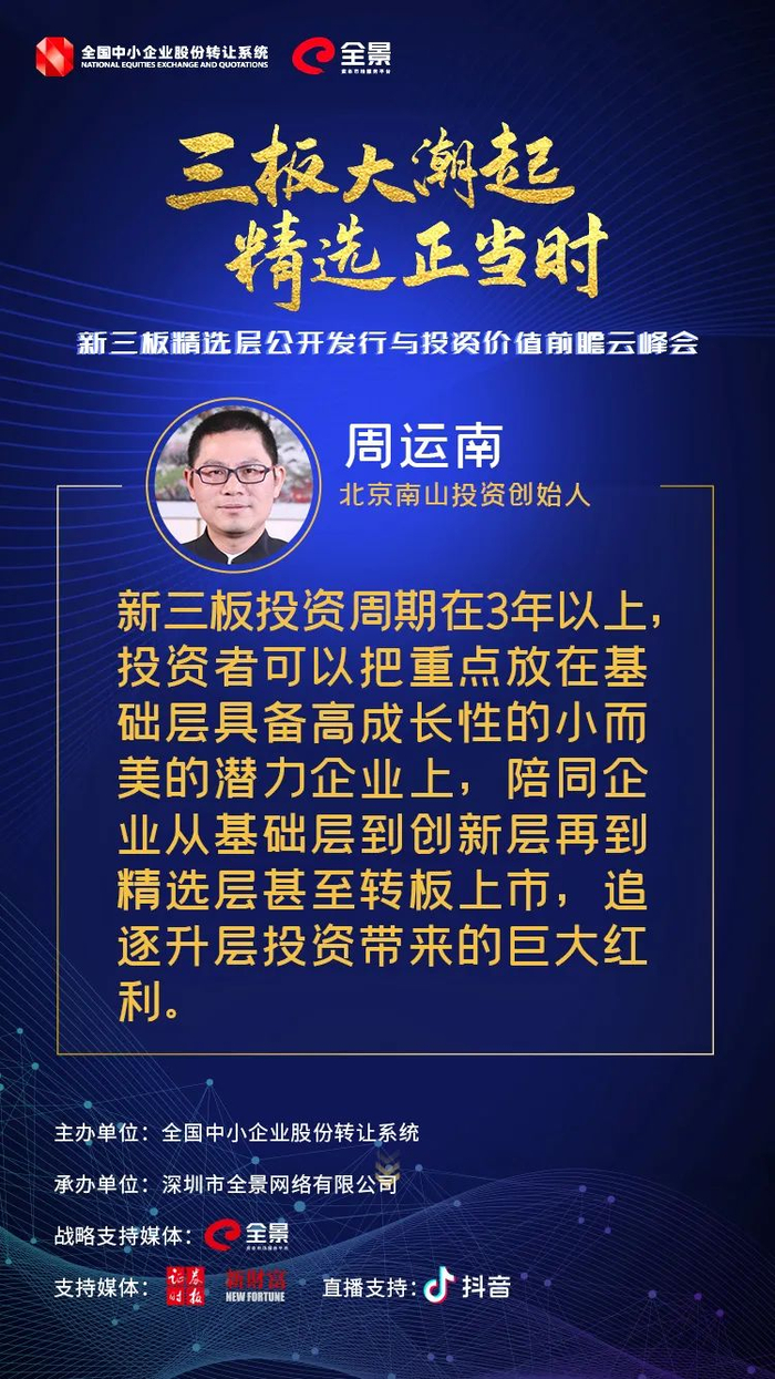 周运南建议,“新三板投资周期在3年以上,投资者可以把重点放在基础层具备高成长性的小而美的潜力企业上,陪同企业从基础层到创新层再到精选层甚至转板上市,追逐升层投资带来的巨大红利。”