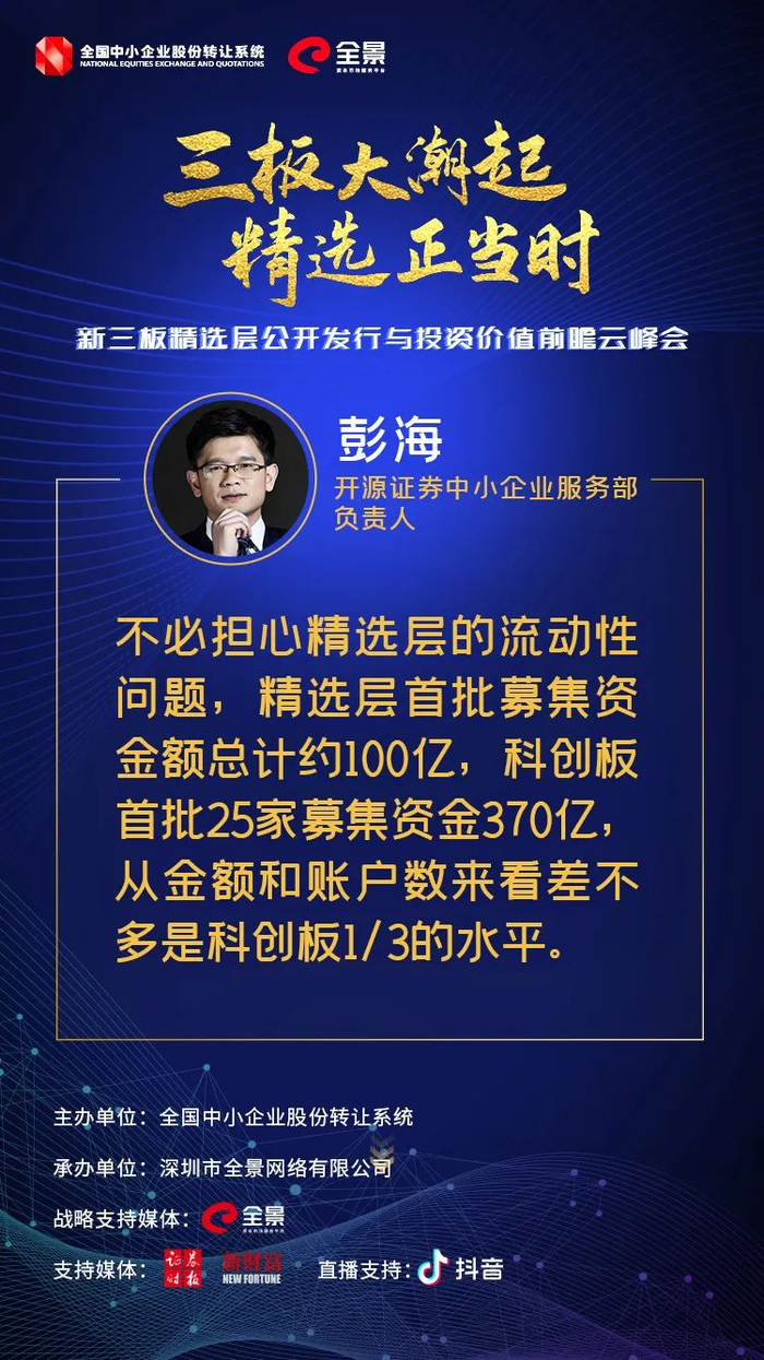 同时,彭海强调,不必担心精选层的流动性问题,精选层首批募集资金额总计约100亿,科创板首批25家募集资金370亿,从金额和账户数来看,差不多是科创板1/3的水平。