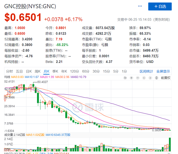 2013年12月,GNC公司的股价为56美元/股,处于历史高位。随后便一路下滑。目前GNC公司的股价已不足1美元/股。