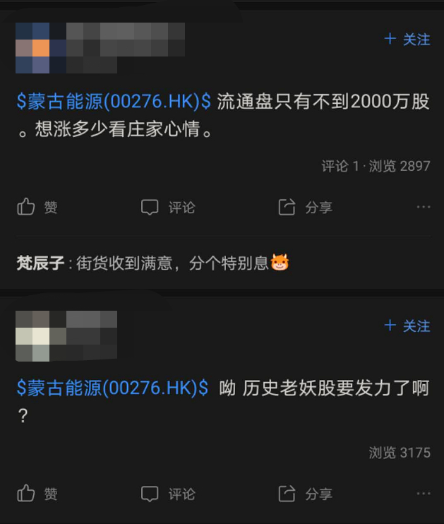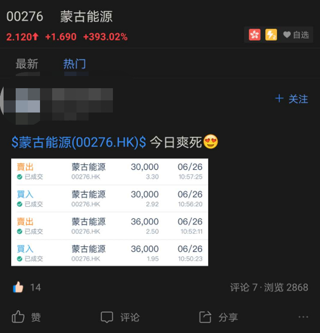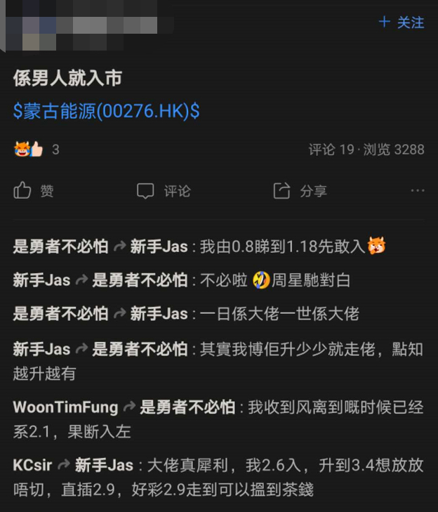 在社区讨论中,围绕蒙古能源的讨论也一度热炒;不少港股投资者透露,已经快速跟随蒙古能源股价上涨、果断冲入,迅速完成了日内交易。