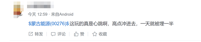 一边是涨幅过快,一边是要保证快速收益而不套牢,这也让蒙古能源股票上场内的资金博弈异常激烈。有投资者更是惊呼:“这样的投资如同道刀口舔血,太刺激了!”