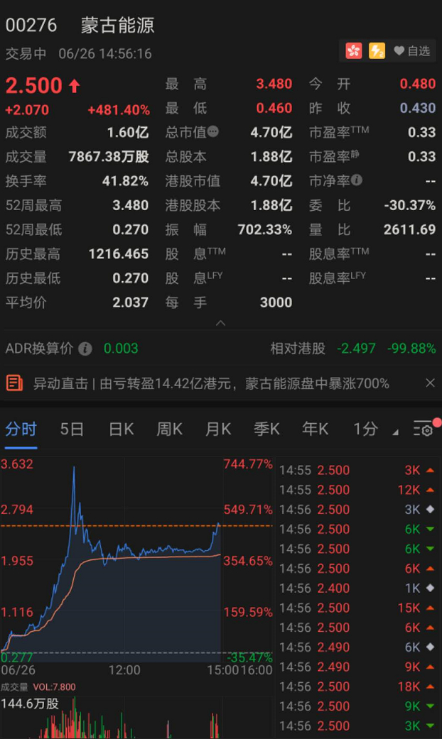短短一个小时后,蒙古能源的股价就从0.430港元的位置,迅速暴力拉升到了最高3.480港元。区间涨幅高达700%!