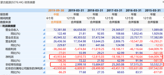 值得注意的是,过去多年,蒙古能源的非经常损益的数额却非常高,2015年、2016年披露的年报显示,在营业利润巨亏的情况下,非经常损益竟然高达5亿元左右。