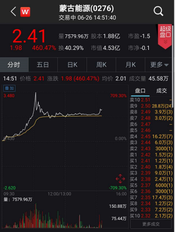 6月26日早盘,港股上市公司蒙古能源出现了一波诡异的疯涨行情。当天开盘,蒙古能源股价高开高走,随后股价一路狂飙。