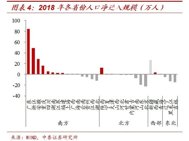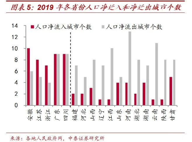 从具体省份来看,人口的流向变得更加集中。2019年浙江和广东人口净流入规模就达到了84.1万和82.6万,在全国层面遥遥领先。根据我们计算,70%以上的人口净迁入量都流向了浙江和广东,而前两年这个比例都只有60%左右。与其说人口流向了东部和南方省份,不如说是更加集聚地流向了广东和浙江两省,“二八”现象愈发明显。