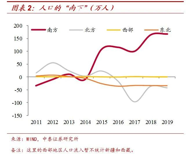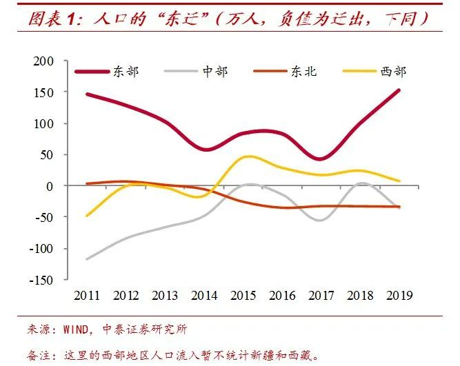 2019年,我国人口流动的方向进一步加强了2018年的大趋势,继续呈现“东迁”和“南下”的特征。2019年我国东部省份人口净流入规模超过150万,而按照秦岭-淮河一线来划分南北方的话,南方省份人口净流入达到167万。而且东部和南方省份的人口迁入规模,相比2018年进一步增加。