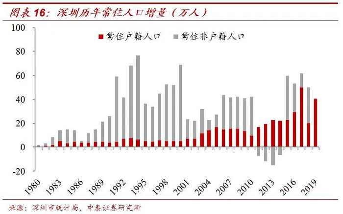 这也就能解释,为何近期深圳房价的上涨压力会比较大。2019年深圳常住人口增加了41.2万,其中常住户籍人口的增量就有40万,常住非户籍人口只增加了1.13万,如果扣除人口自然增长,常住非户籍人口可能还是减少的。这就意味着,去年深圳农民工或许在净迁出,而迁入的人口大多是符合落户条件的引进人才,这部分人口的净迁入对房价的推升作用更加明显。