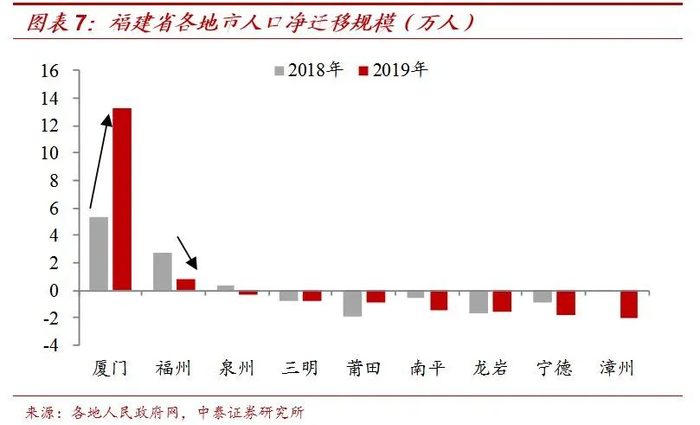 而且即使是各省内的核心城市,2019年也出现了非常明显的分化。以福建为例,2018 年厦门和福州人口净迁入量分别为5.37万和2.76万,相差不大;但2019年两个城市的差距明显拉开,厦门净迁入量达到了13.3万人,而作为省会城市的福州,净流入量只有0.8万人。这说明,在经济和政策因素的驱动下,人口在地区之间的分化在加剧。
