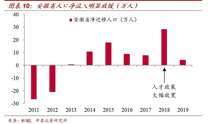 3、“抢人”愈演愈烈,新一线明显发力。从城市等级来看,一二线城市人口持续流入,三四五线城市人口在持续流出。18年“抢人”大战比较成功的安徽省和西安市,19年人口迁入规模明显放缓。核心城市都开始加入“抢人”队伍,未来中小城市的人口流出压力还会更大。