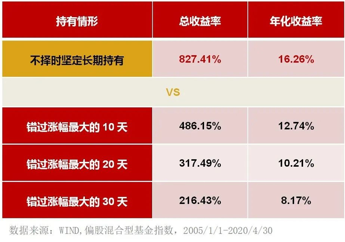 同时,我们测算了A股市场的偏股混合型基金的表现情况,在2005年1月1-2020年4月30日,A股经历了多次牛熊起伏,该指数年化收益率为16.26%。错过涨幅最大的30天,年化收益率降低到8.17%。15年中错过涨幅最大的396天,最终投资收益将归零: