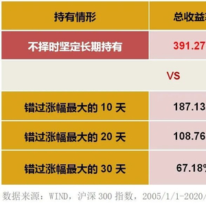 从上图可以看到,如果在这15年的时间里,我们坚定长期持有,总收益率超过390%。但是,随着错过最大涨幅天数的增加,最终投资收益被大幅侵蚀。