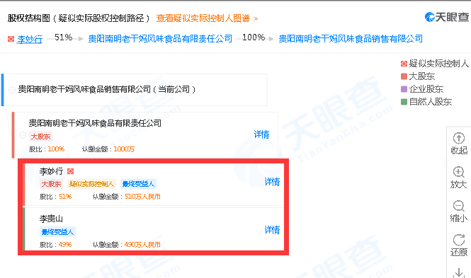 天眼查信息显示,贵阳南明老干妈风味食品有限责任公司持有贵阳南明老干妈风味食品销售有限公司100%股权。贵阳南明老干妈风味食品有限责任公司则两位股东,李妙行持股51%、李贵山持股49%,据悉二人均为陶碧华亲属,其中李贵山是陶碧华长子。