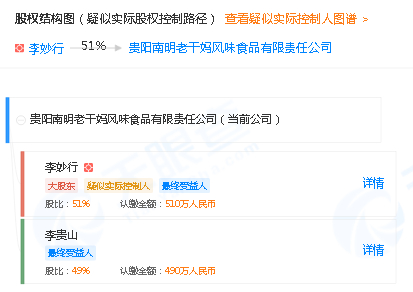 贵阳南明老干妈风味食品有限责任公司的股东也是李妙行持股51%、李贵山持股49%。