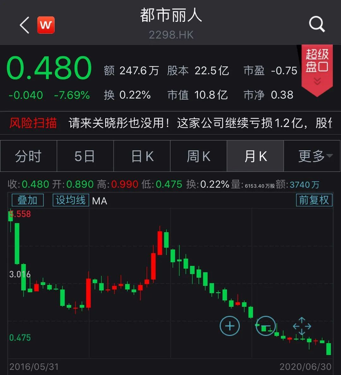 经营陷入困境的都市丽人,在二级市场的表现也不如人意,今年以来已跌去56%,截至6月30日盘后,其股价报0.48港元/股,总市值仅剩下10.8亿港元。