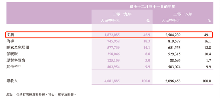 从营收构成来看,近几年,文胸一直为都市丽人贡献了约50%的营收。但2019年,这一产品的营收占比降至45.9%。