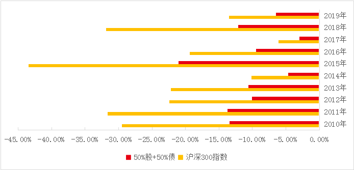 但50%股票+50%债券的 投资组合,同期年度最大回撤基本都控制在15%以内,仅有2015年超过了20%。