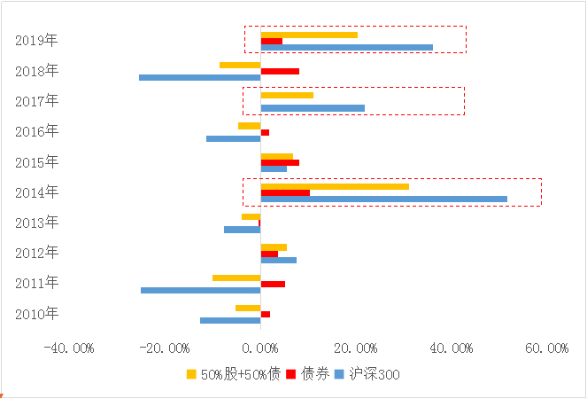 那么在过去10个完整年度中,我们这个投资组合的收益率在股市走强的年份(比如2014、2017、2019年)都能够显著跑赢债券收益率。