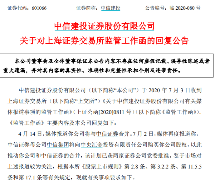 几乎同时,中信建投也就此事回复上交所,中央汇金称:针对函中征询事项,截至目前,我公司不存在涉及你公司应披露而未披露的重大信息。